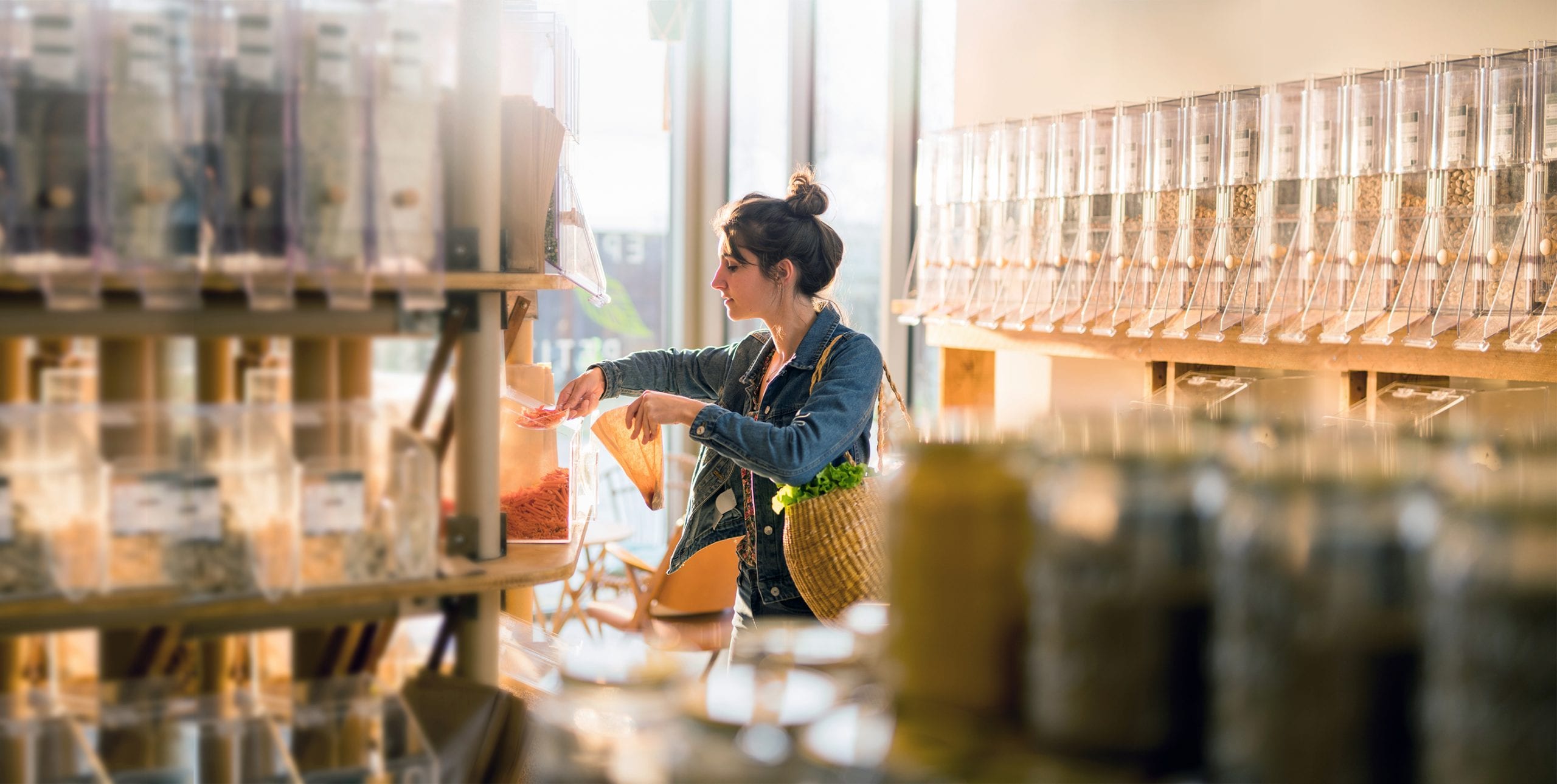 Next time you hit the grocery store, see if there’s a section with food sold in large bulk bins, open-market style. Rice, nuts, beans, flour, grains, cereals, and spices are common bulk-bin items. You can even bring your own containers from home, such as cloth drawstring bags or glass jars, and fill them with the amount of each item you need.