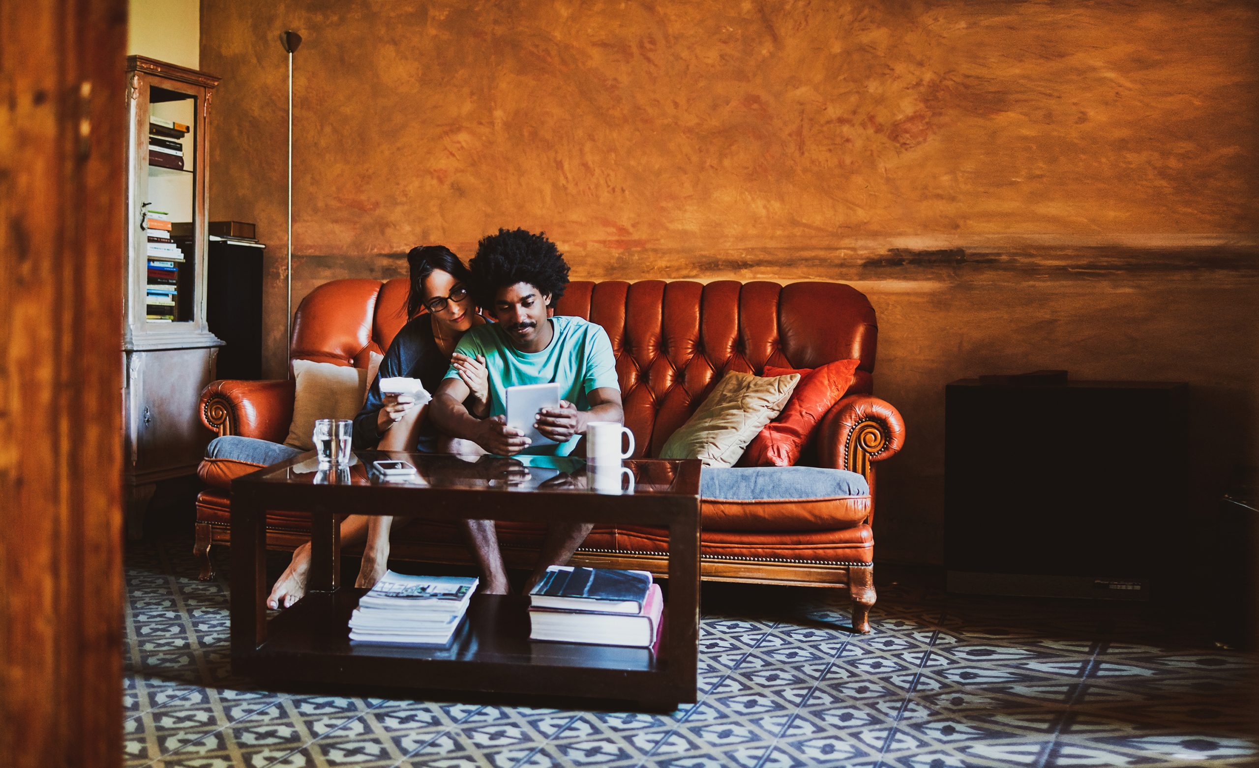A woman sits on the floor next to a sectional couch looking at her phone and holding a notebook.